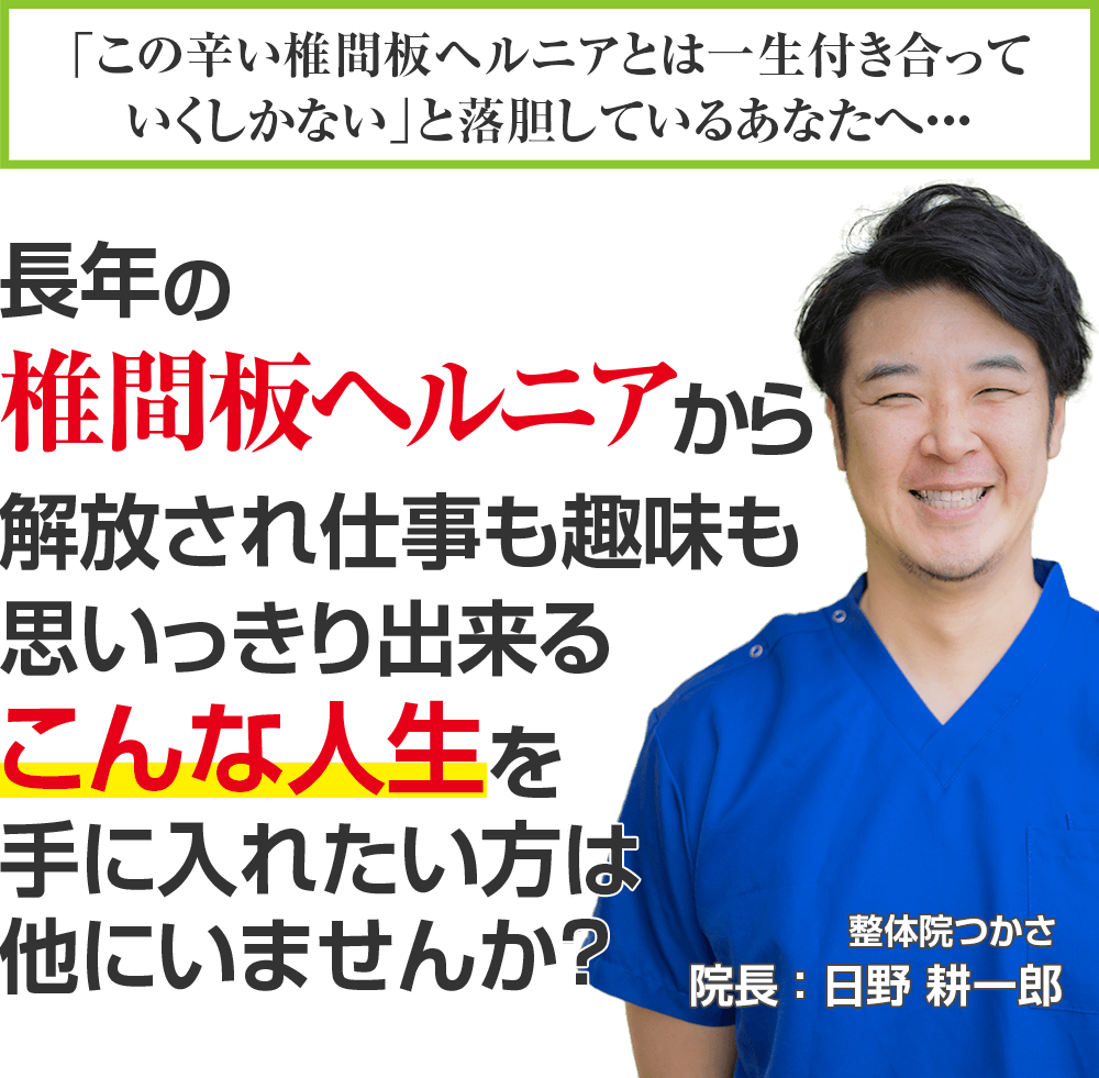 10年間で延べ2万件以上の実績を持ち、自身も椎間板ヘルニアで苦しんだ経験を生かし、誰よりも親身に向き合うことができる印西市で唯一の椎間板ヘルニア専門整体院つかさに来院し、痛みを我慢することのない人生を歩んでいく道。